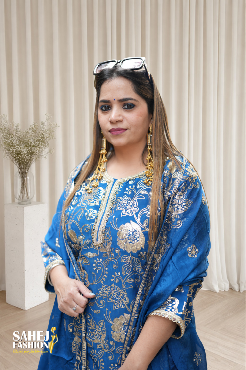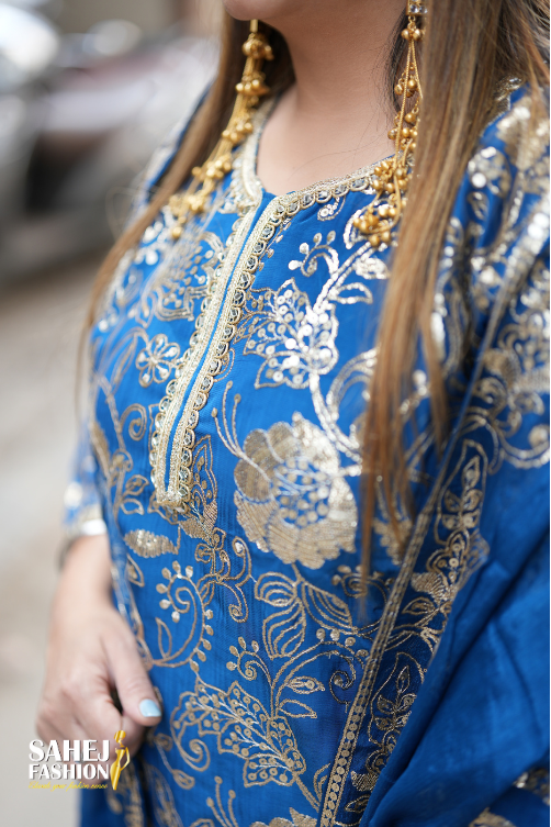 Kurta: Crafted in a rich royal blue base, the kurta is adorned with intricate gold floral and paisley embroidery spread gracefully across the fabric. The straight-cut silhouette offers a flattering and comfortable fit. Designed with a classic keyhole neckline highlighted by detailed gold embroidery, adding a regal touch. Three-quarter sleeves with embroidered borders perfectly complement the overall design. Finished with a scalloped embroidered hem, enhancing the traditional appeal.